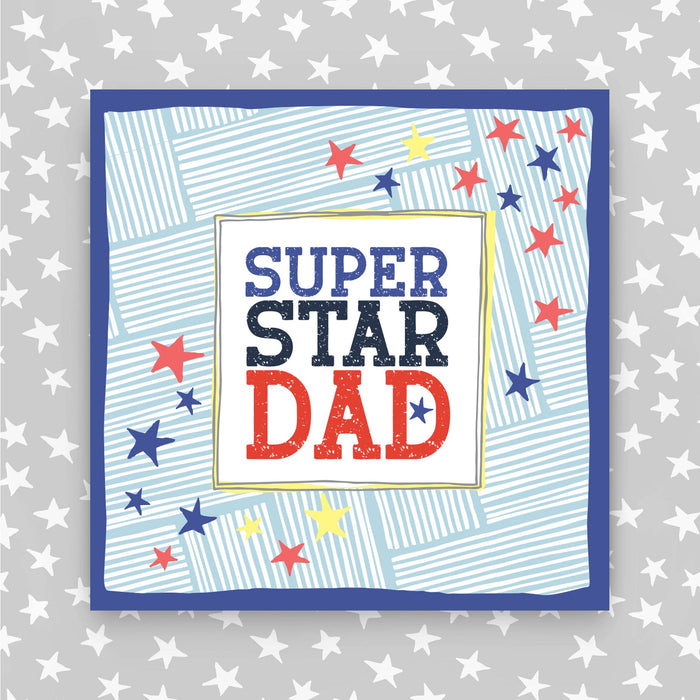 Super Star Dad. Foiled with silver. Sealed by Belly Band, cello wrapped or nested with a white envelope.