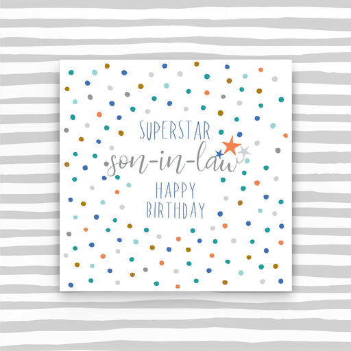 Super Star Son-in-law Happy Birthday. Printed on luxury board, embossed and foiled. Supplied with a luxury envelope. Printed in the UK on high qual...