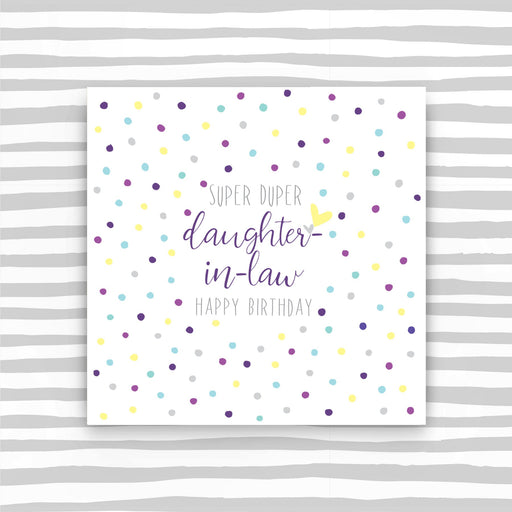 Super Duper Daughter-in-law Happy Birthday. Printed on luxury board, embossed and foiled. Supplied with a luxury envelope. Printed in the UK on h...