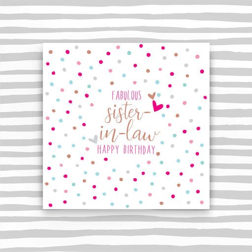 Fabulous Sister-in-law Happy Birthday. Printed on luxury board, embossed and foiled. Supplied with a luxury envelope. Printed in the UK on high qua...