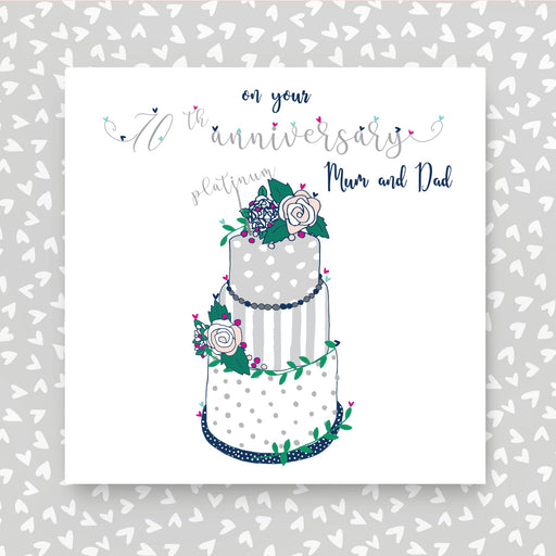 Mum & Dad Platinum Wedding Anniversary. Printed on luxury board, hand-finished with glitter. Supplied with an luxurious pearlescent envelope. P...