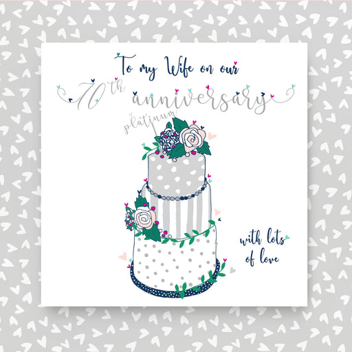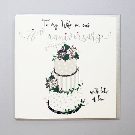 Wife 70th Wedding Anniversayr Card. Printed on luxury board, hand-finished with glitter and pearls. Supplied with an luxurious pearlescent envelope...