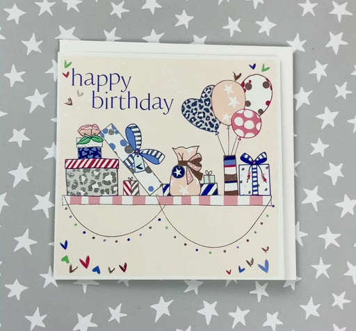 Happy Birthday - Present and balloons. Printed on luxury board, embossed and foiled. Supplied with a matching envelopee. Printed in the UK on hig...