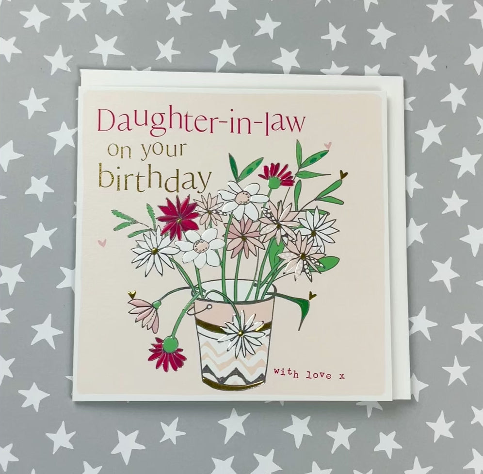 Happy Birthday Daughter-in-law - Bucket of Flowers. Foiled and embossed. Supplied with an envelope.