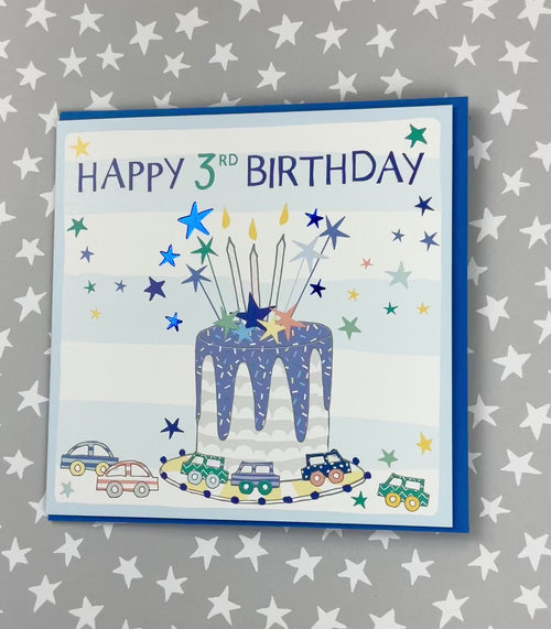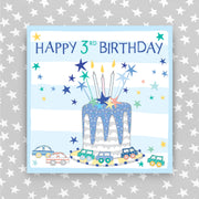 3rd Birthday Boy. Foiled with silver. Supplied with a blue envelope.
