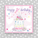 1st Birthday Girl. Foiled with silver. Supplied with a pink envelope.