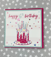 6th Birthday Girl. Foiled with silver. Supplied with a pink envelope.