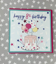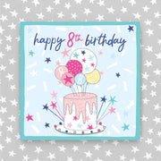 8th Birthday Girl. Foiled with silver. Supplied with a pink envelope.