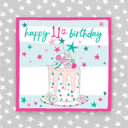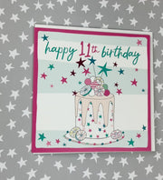 11th Birthday Girl. Foiled with silver. Supplied with a white envelope.