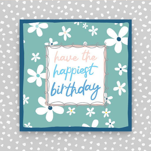 Have the Happiest Birthday - white flowers on green. Foiled with silver. Sealed by Belly Band, cello wrapped or nested with a white envelope. Pri...