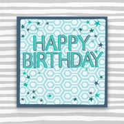 Happy Birthday - hexagon pattern greeting card. Foiled and supplied with a coloured envelope.