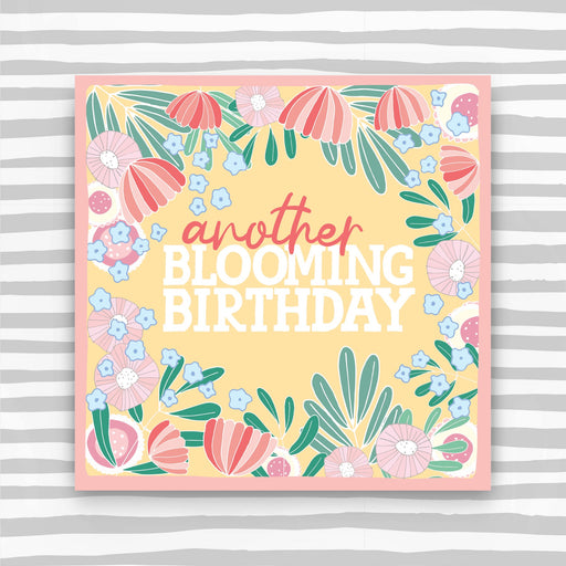 Another Blooming Birthday Card - Pink flowers on yellow background. Supplied Supplied with a white envelope. Printed in the UK on high quality l...