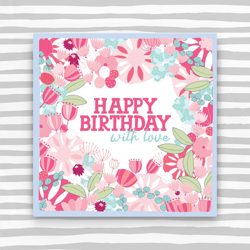 Happy Birthday Card, with love - Pink flowers with pale blue border. Supplied Supplied with a white envelope. Printed in the UK on high quality ...