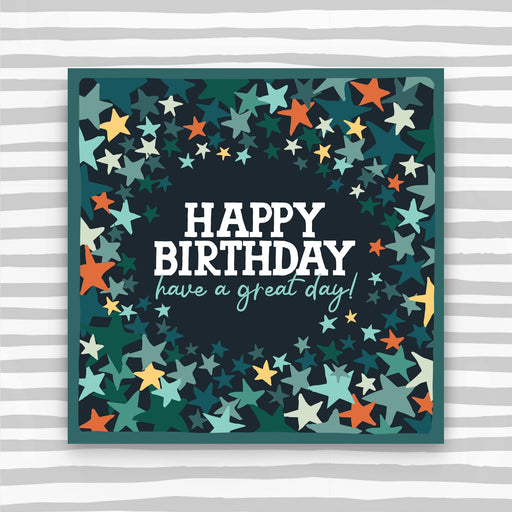 Happy Birthday Card, have a great day! - Green Stars. Supplied Supplied with a white envelope. Printed in the UK on high quality luxury board fr...
