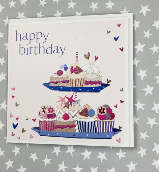 Happy Birthday - Cake stand. Foiled and embossed. Supplied with an envelope. Printed in the UK on high quality luxury board from renewable source...