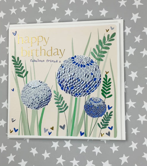 Happy Birthday fabulous friend - Pink flowers on turquoise background. Supplied Supplied with a white envelope. Printed in the UK on high qualit...