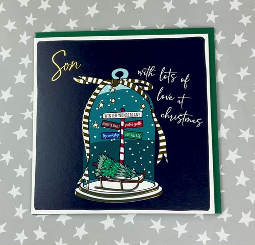 Son - with lots of love at Christmas. Finished with a raised liquid gold. Supplied cello wrapped or nested with an envelope.