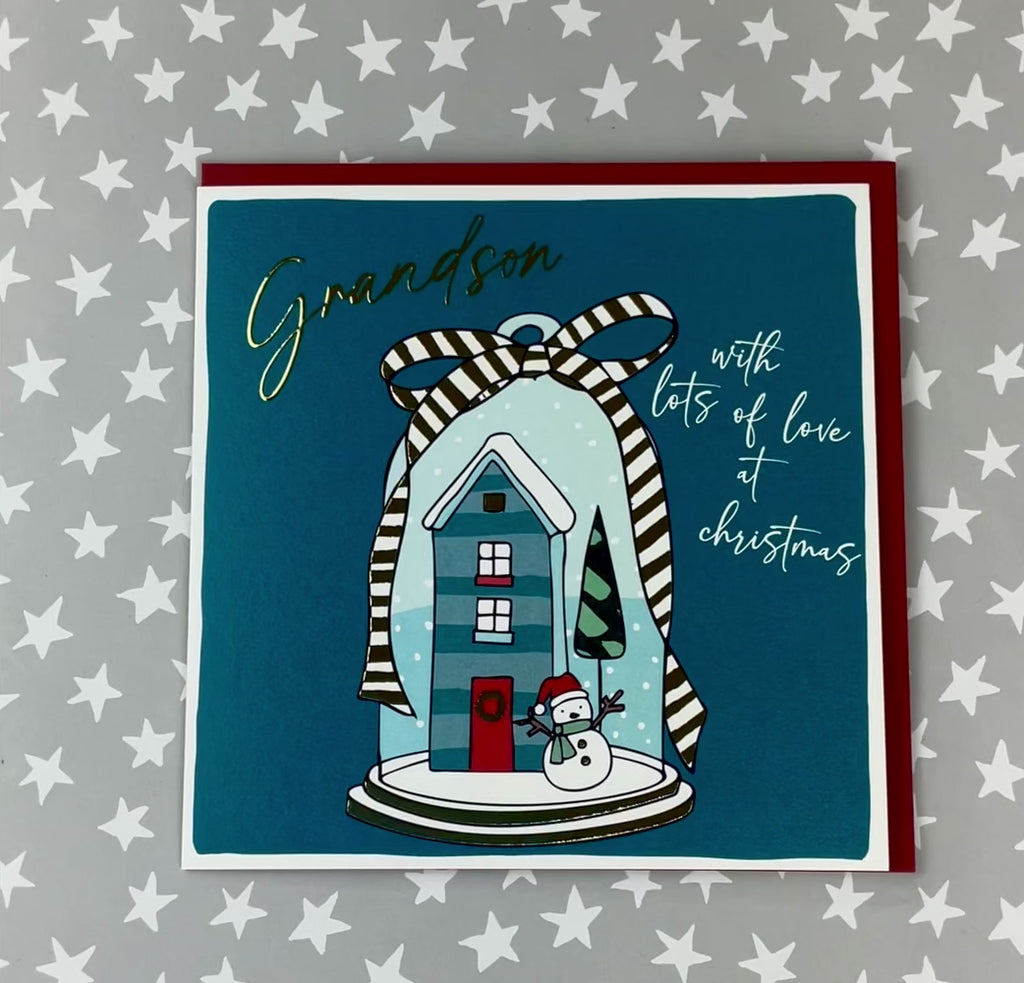 Grandson - with lots of love at Christmas. Finished with a raised liquid gold. Supplied cello wrapped or nested with an envelope.