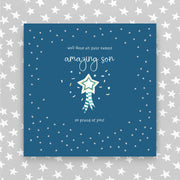 Well Done on your exams amazing Son Greeting Card. Finished with foiled dots and hand-embellished. Supplied with a luxury envelope.