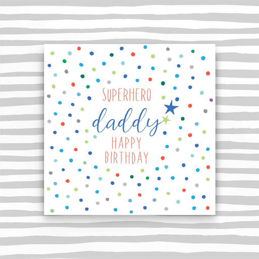 Super Hero Daddy Happy Birthday. Printed on luxury board, embossed and foiled. Supplied with a luxury envelope. Printed in the UK on high quality l...