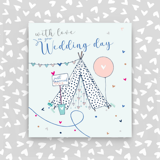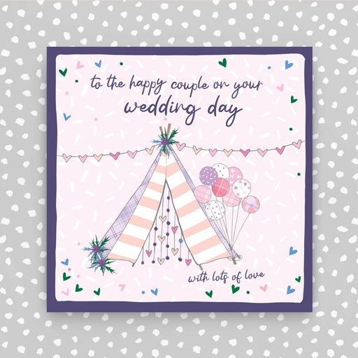 To the new Mr & Mrs - Tepee Wedding Scene. Foiled and Embossed. Supplied with a grey envelope. Printed in the UK on high quality luxury board...