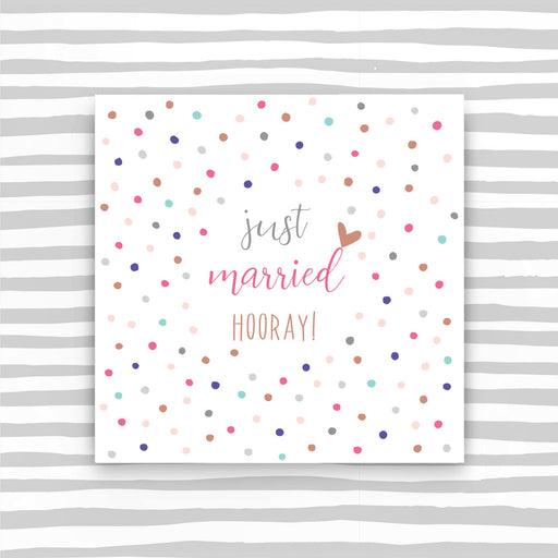 Just Married - Hooray! Printed on luxury board, embossed and foiled. Supplied with a luxury envelope. Printed in the UK on high quality luxury boar...