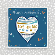 Happy Anniversary - Love you Mr greeting card. Foiled, embossed and supplied with a white envelope.