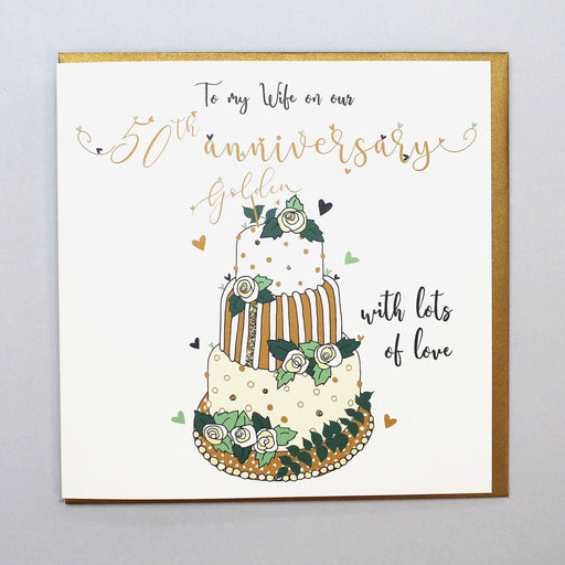 Wife 50th Wedding Anniversary Card. Printed on luxury board, hand-finished with glitter and pearls. Supplied with an luxurious pearlescent envelope...