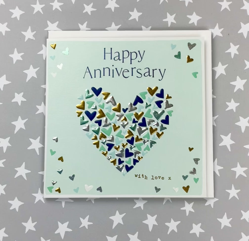 Happy Anniversary - Heart. Foiled and embossed. Supplied with an envelope.