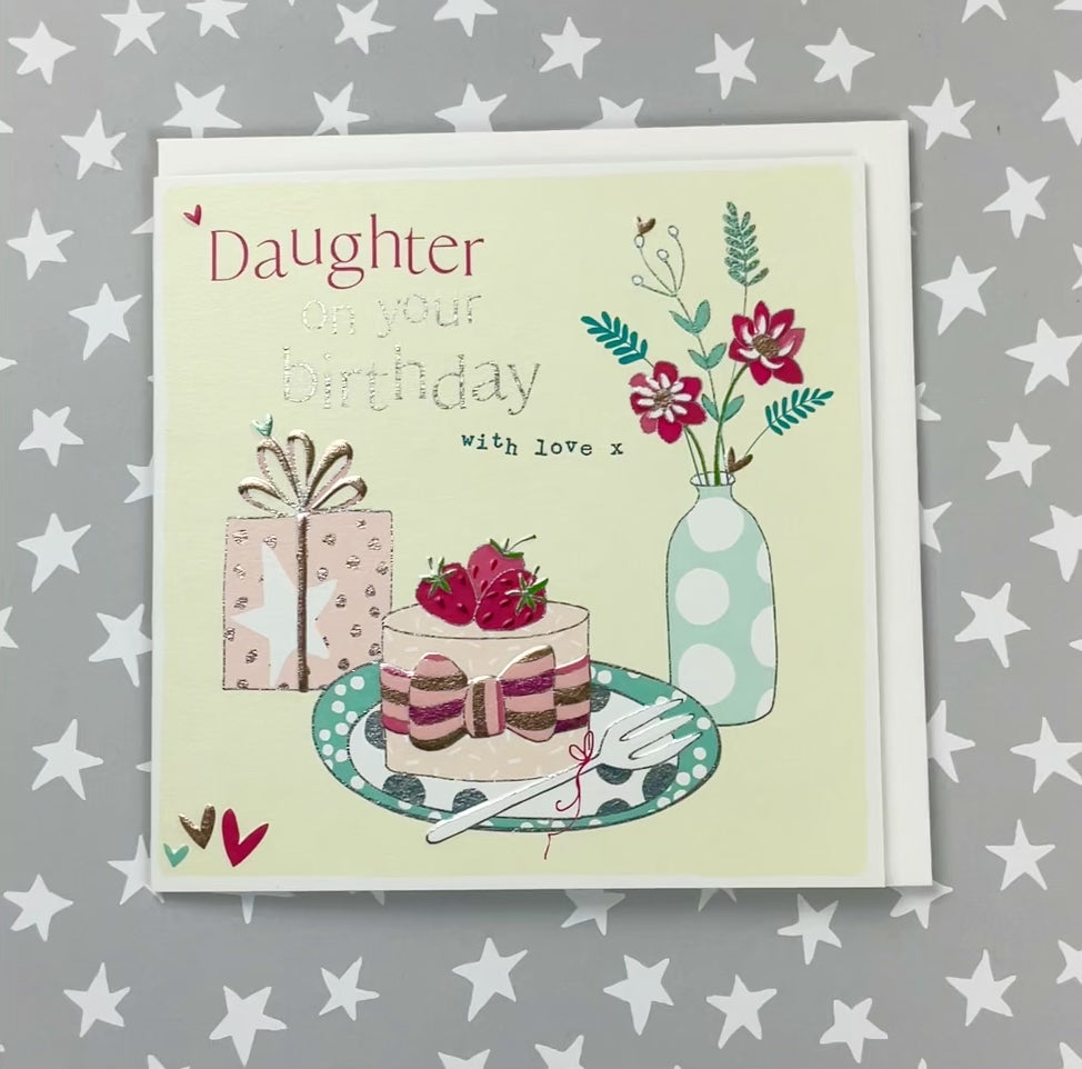 Happy Birthday Daughter - Cake and present. Foiled and embossed. Supplied with an envelope.