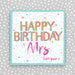 Happy Birthday Mrs. Finished with foiled lettering. Supplied with an envelope.