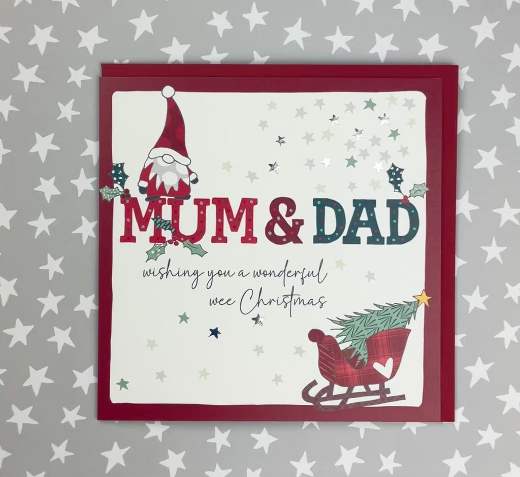 Mum and Dad - Scottish Christmas Card. Foiled with silver Supplied with a red envelope.