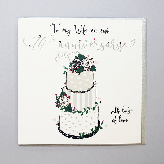 Wife 70th Wedding Anniversayr Card. Printed on luxury board, hand-finished with glitter and pearls.