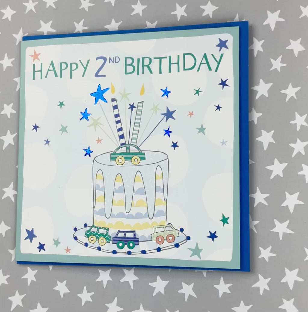 2nd Birthday Boy. Foiled with silver. Supplied with a blue envelope.