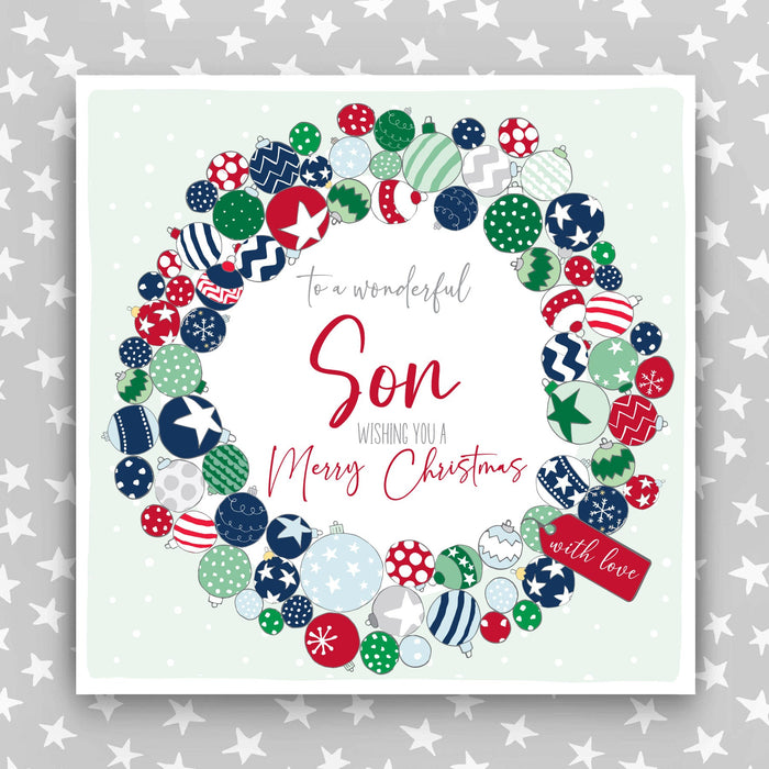 Son - Large Wreath Christmas Card. Hand finished with red glitter. Sealed by belly band, cello wrapped or nested with a red envelope.
